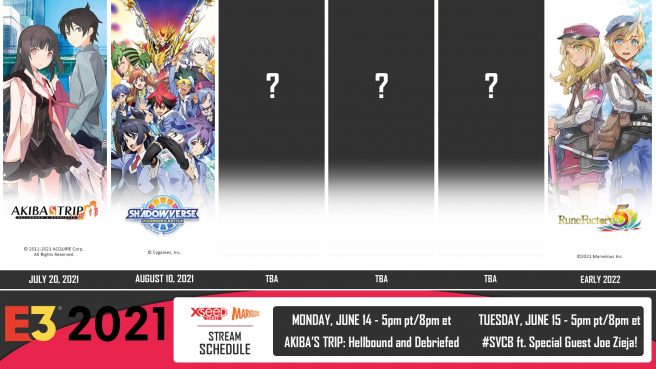Akiba’s Trip: Hellbound & Debriefed, Shadowverse: Champion’s Battle, and Rune Factory 5 will all be featured. It also looks like three announcements are in store.
