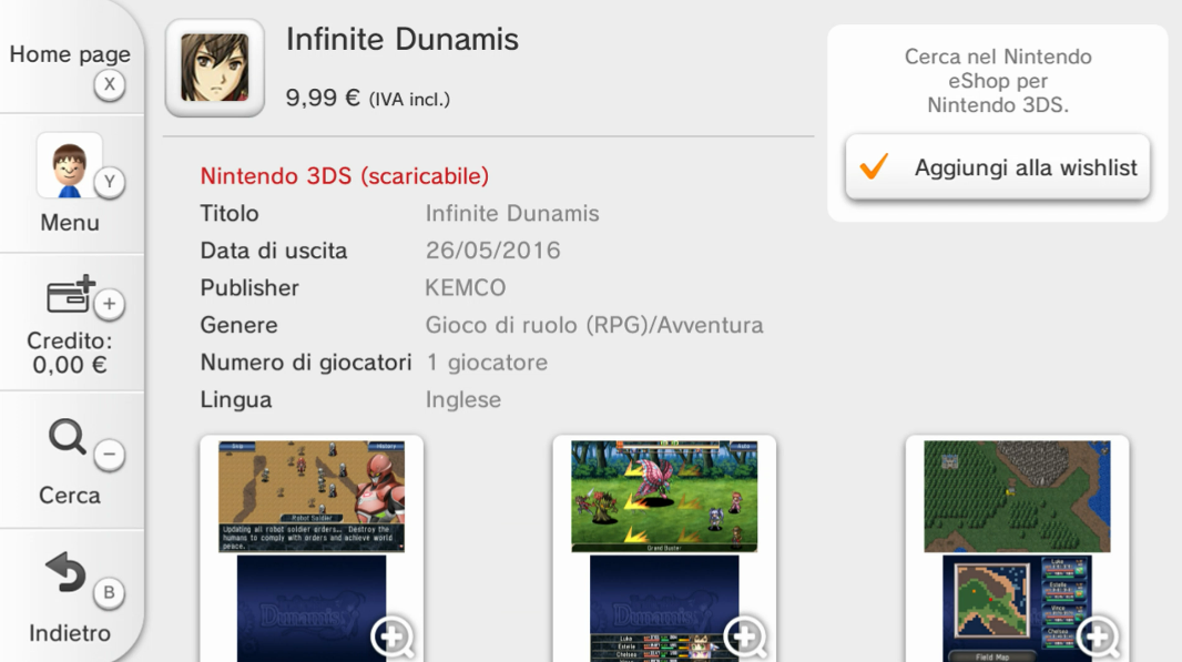 Another game has been confirmed for release on the European 3DS eShop next week. As revealed through a listing on the store, the RPG Infinite Dunamis is scheduled for May 26. Pricing is set at €9.99.