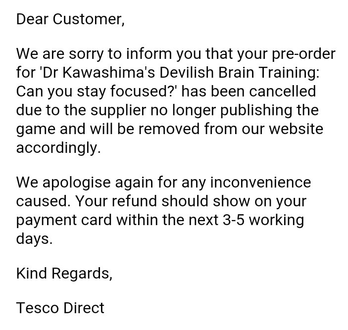 Tesco Direct has started cancelling pre-orders for Dr Kawashima’s Devilish Brain Training. Why, you ask? The retailer states in emails sent to consumers that this is due to “the supplier no longer publishing the game”.
