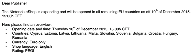 In just a couple of weeks, the European eShop will be open for business in several new European territories. These countries include Cyprus, Estonia, Latvia, Lithuania, Malta, Slovakia, Slovenia, Bulgaria, Croatia, Hungary, and Romania.