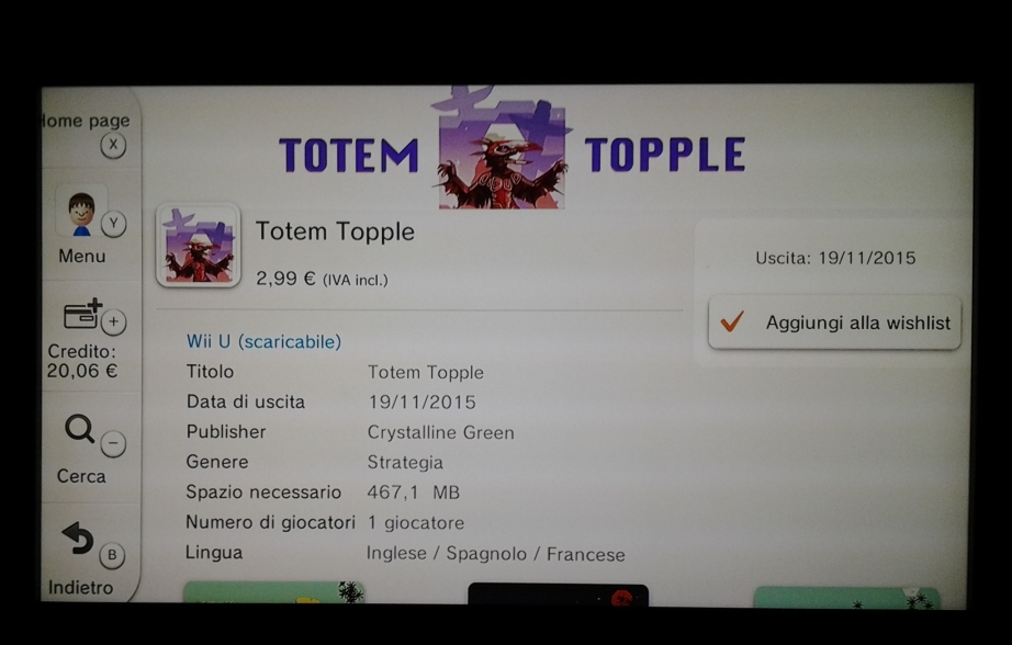 Thanks to a listing on the eShop, we know of one confirmed digital release in Europe next week. Totem Topple will be out for Wii U starting on November 19. Pricing is set at €2.99.