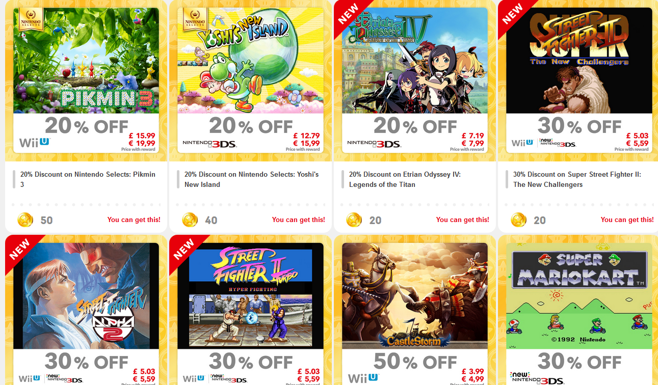 For 20 Gold Points, Super Street Fighter II: The New Challengers, Street Fighter II Turbo: Hyper Fighting and Street Fighter Alpha 2 on Wii U and New Nintendo 3DS are all 30% off. Also for 20 Gold Points, Etrian Odyssey IV on 3DS is 20% off.