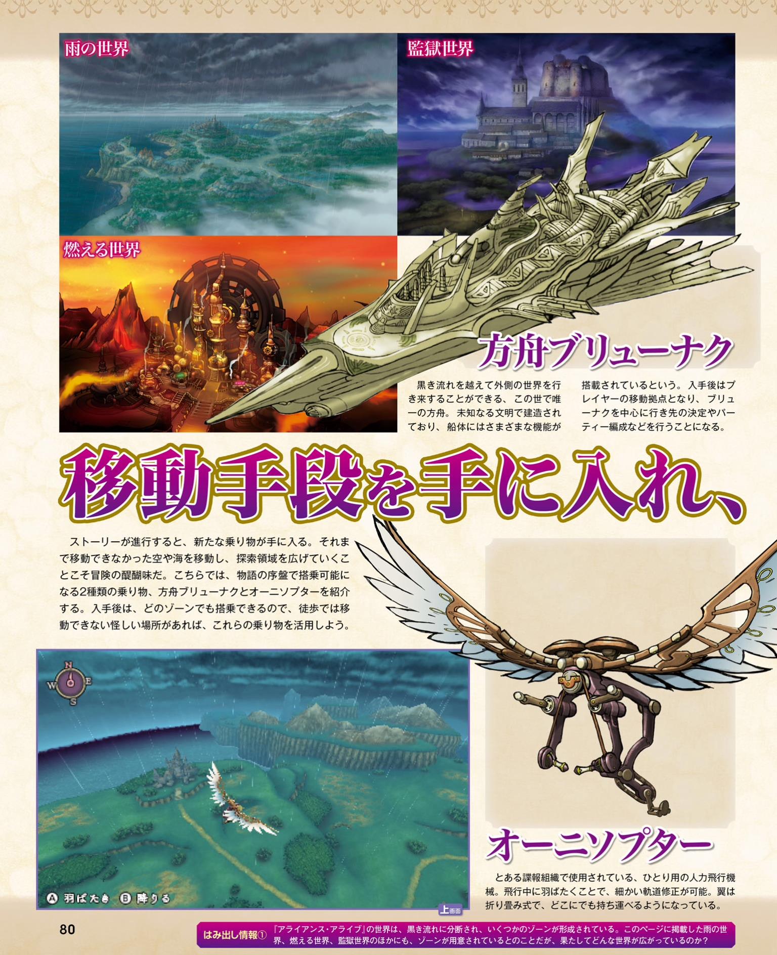 The only ark ship in this universe that can go through the Black Current to travel between worlds. Created by an unknown civilization, many features are included. This will become the player’s moving base after it’s obtained, allowing for destinations to be chosen as well as form the party. Famitsu notes that Brionac’s bridge looks like a shrine, and each character will have their own personal room.