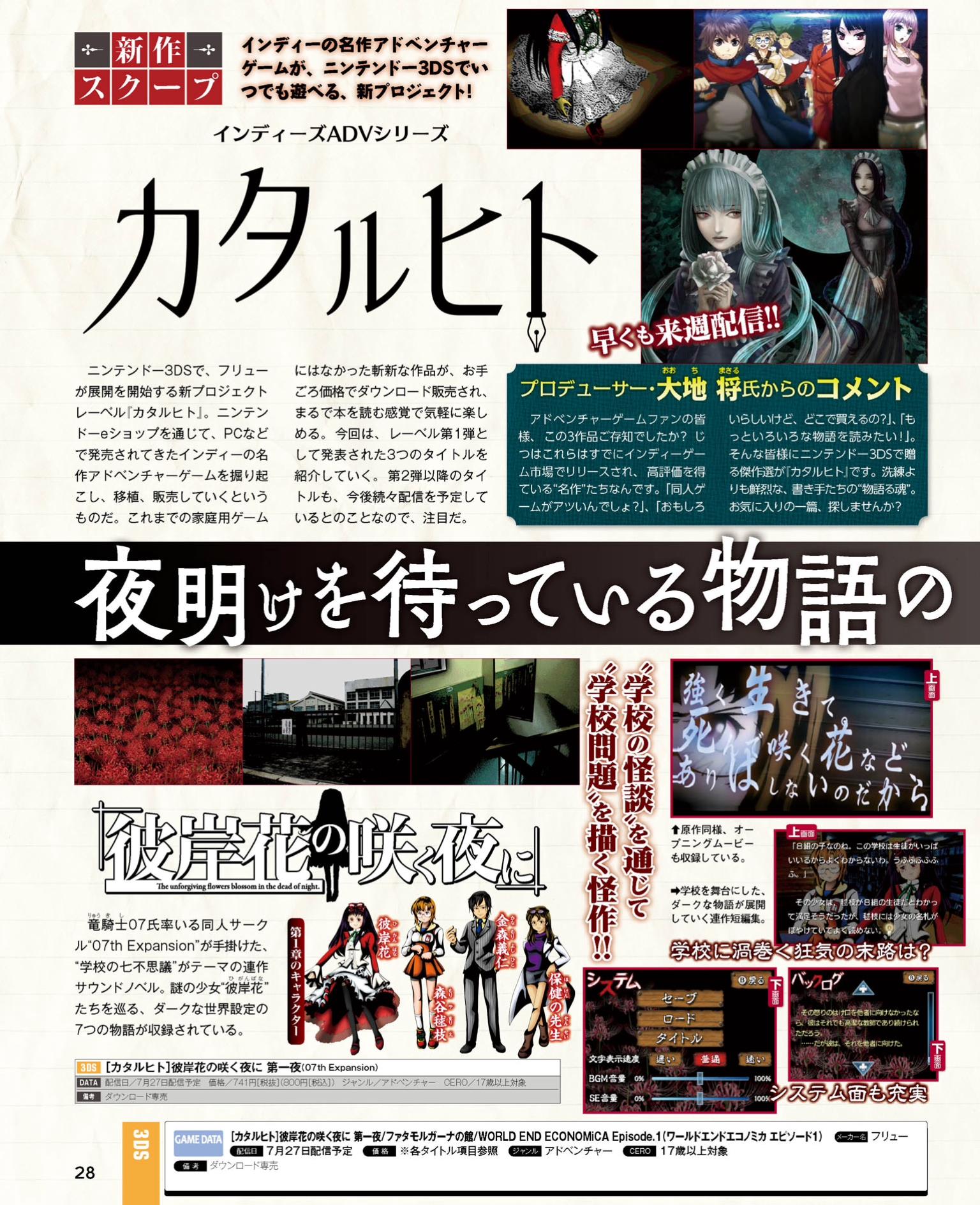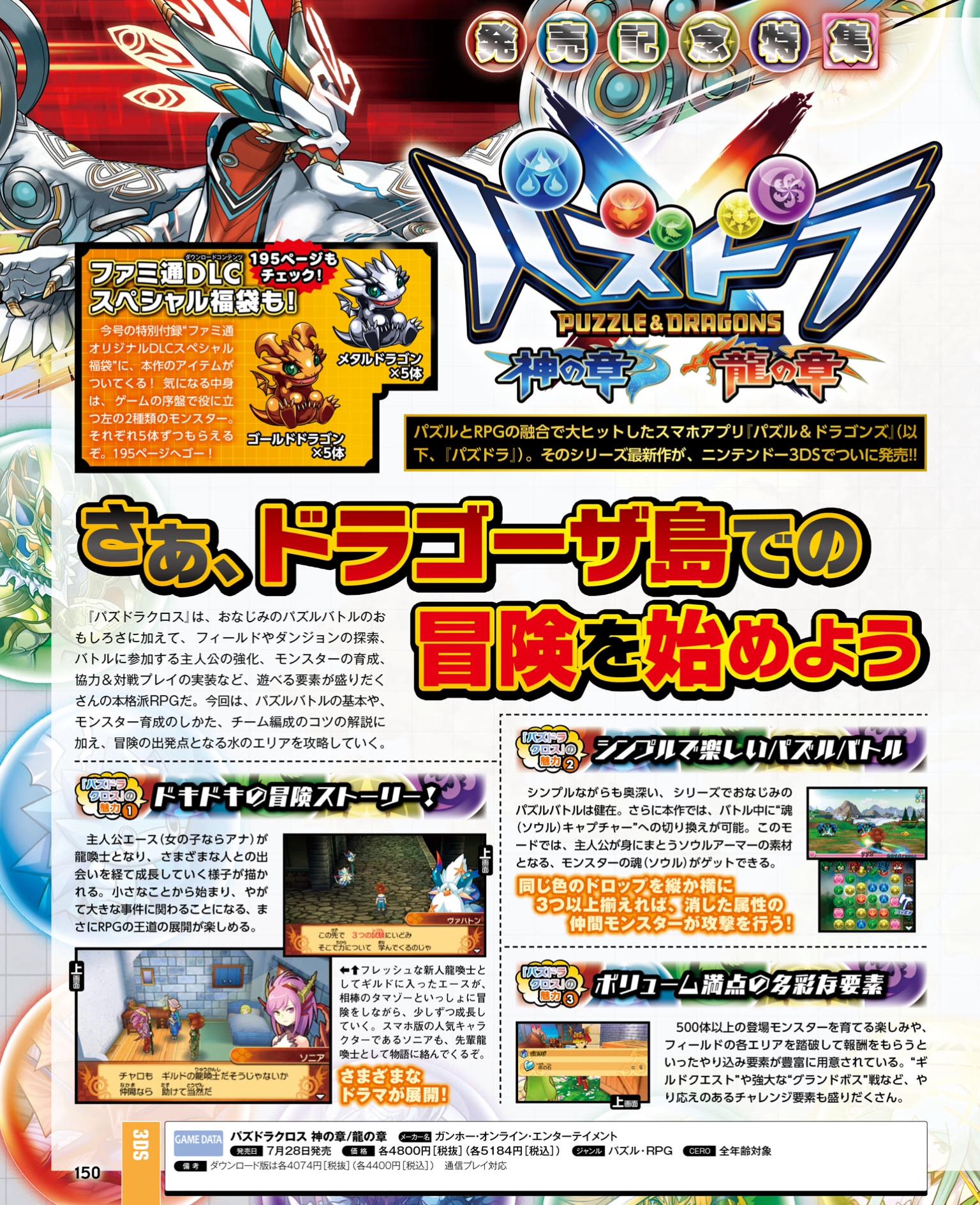 This week’s Famitsu scans are now available. Highlighted games include FuRyu’s 3DS visual novels and Puzzle & Dragons X (also threw in a Splatoon Splatfest ad). Scans of each can be found in the gallery below.