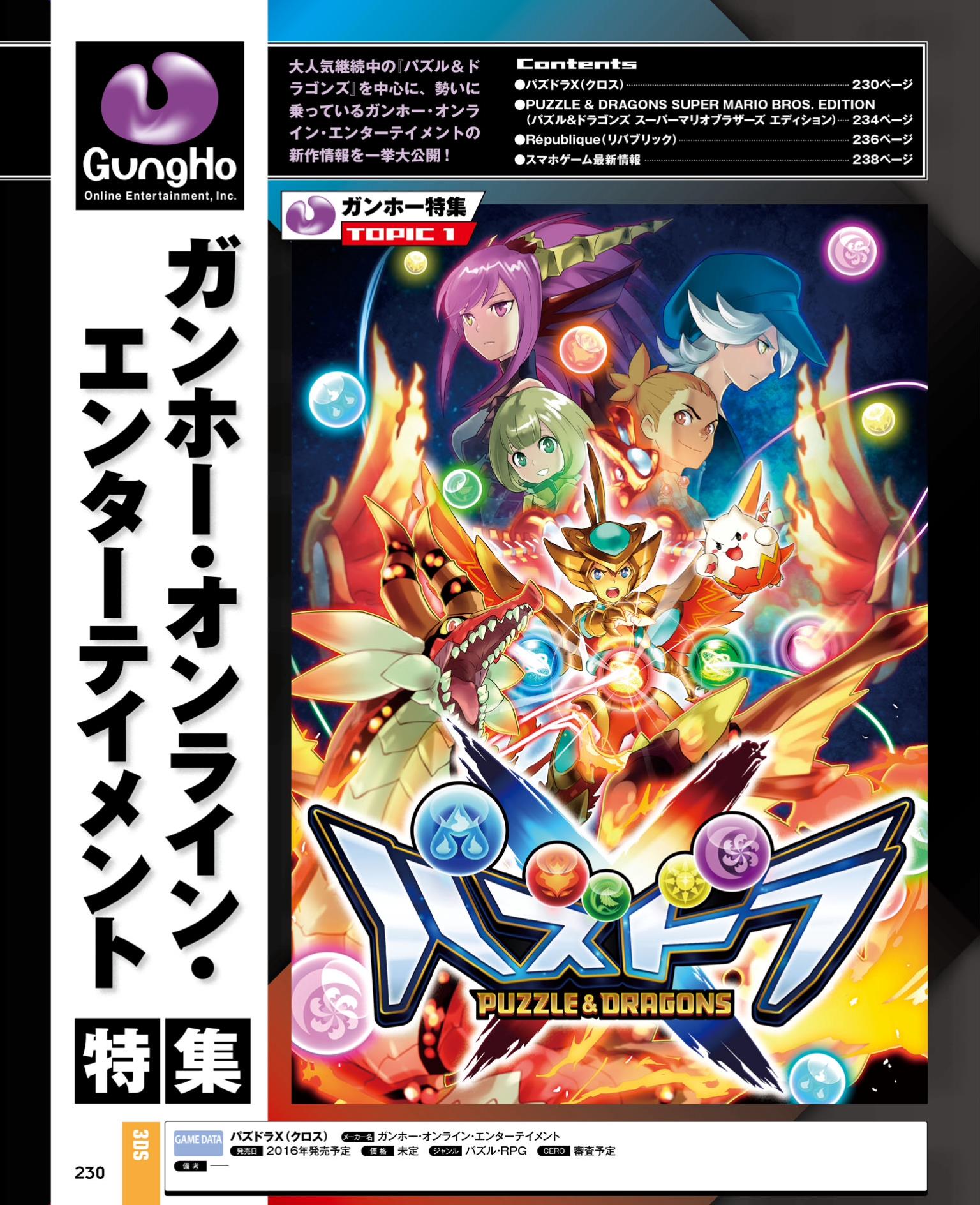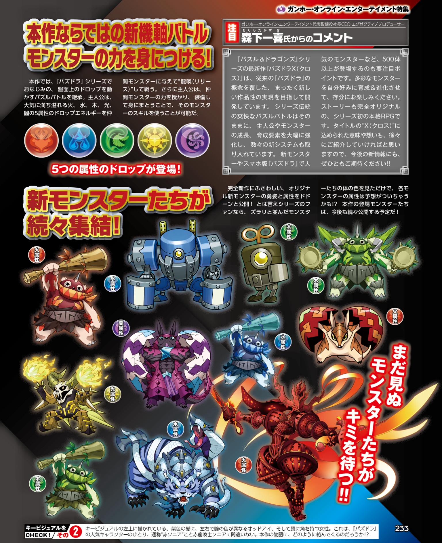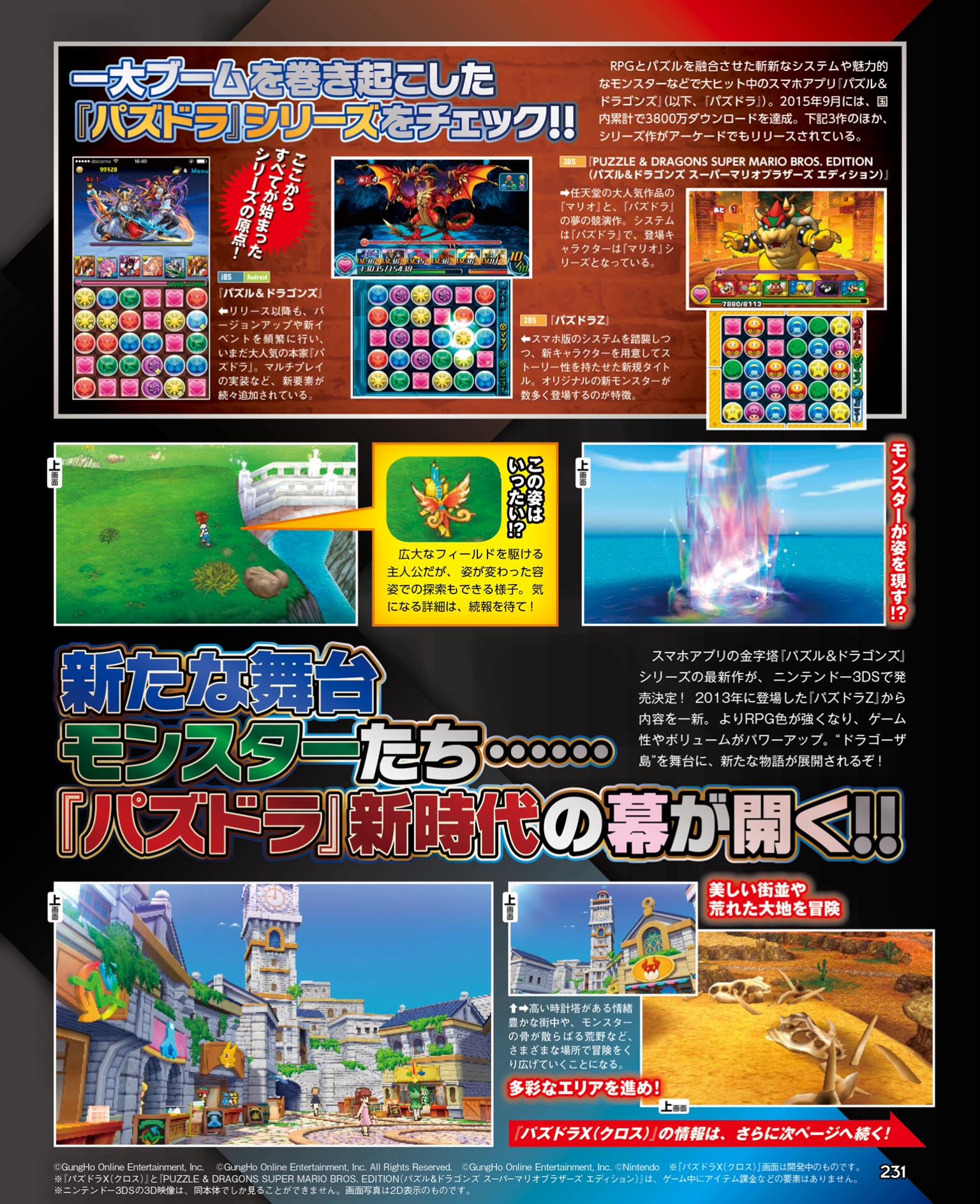 Famitsu has a few details about the newly-revealed Puzzle & Dragons X. According to the magazine, the game features stronger RPG elements plus enhanced gameplay and volume. GungHo Online Entertainment is including over 500 monsters that can be evolved if trained. It’s possible for the hero to use skills via equipment endowed with the power of monsters as well.