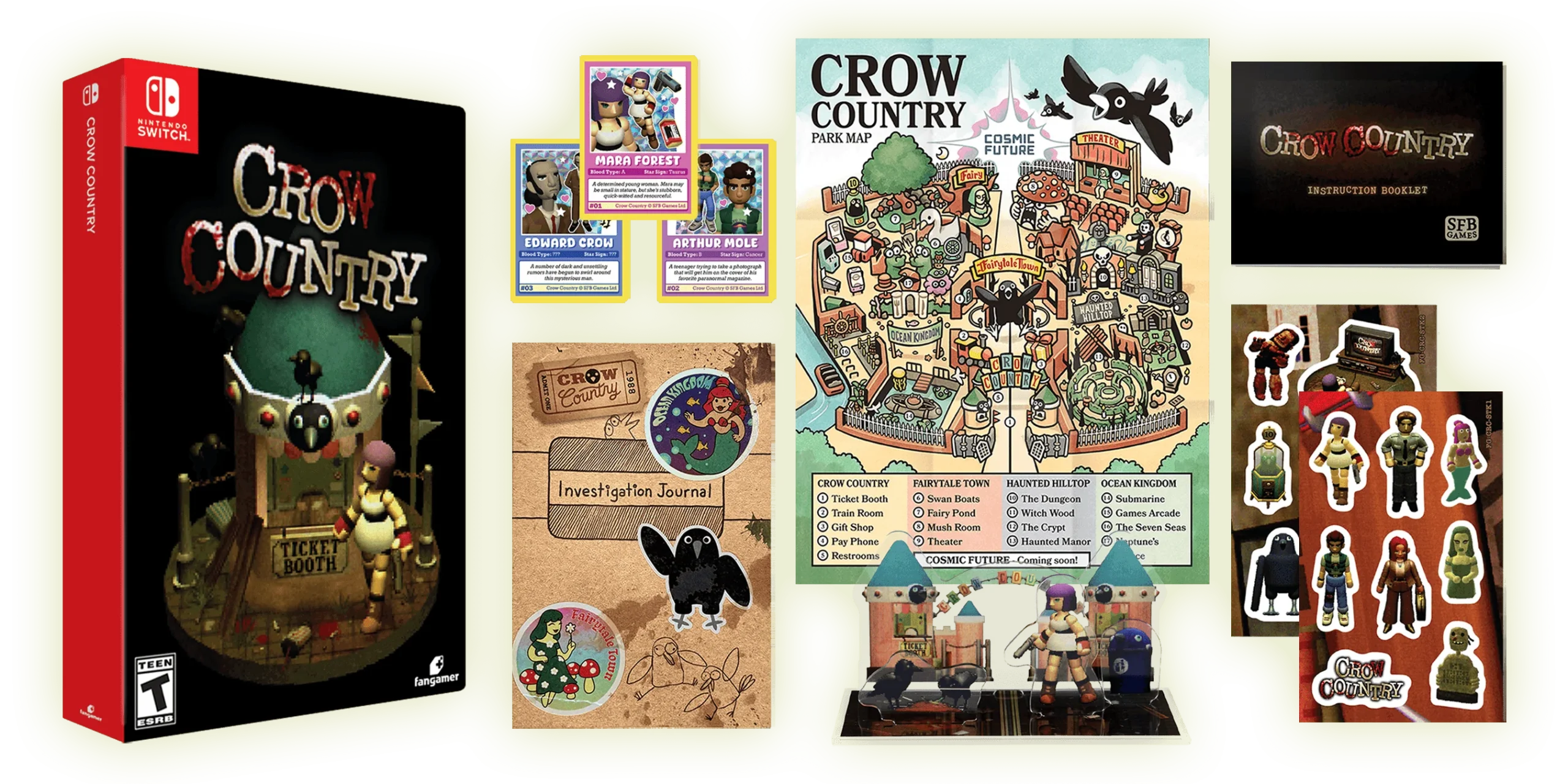 Crow Country will be sold as a standard copy and Deluxe Edition. In the latter, you’ll receive the following bonuses: a 4-piece acrylic standee measuring about 3.1 inches tall and 3.9 inches wide, a 40-page journal for taking important notes, three retro-inspired holographic character cards featuring Mara, Arthur, and Edward Crow, and two kiss-cut sticker sheets. Both versions include a 20-page instruction booklet straight from the developers, filled with tips, character bios, and more plus a 9×12 inch double-sided folded poster showcasing an original park map and promotional flier.