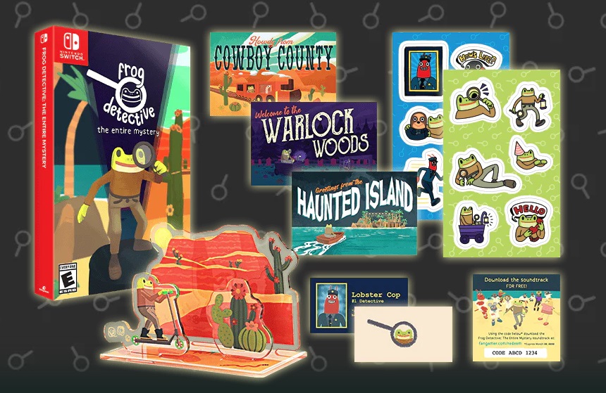 Each copy of the game includes the title on a cartridge, a digital download code for a copy of the complete soundtrack, reversible cover art, and business cards from Frog Detective and Lobster Cop. A Deluxe Edition is also planned which adds f four-piece acrylic mini-standee measuring about 2.3 inches tall and 3.45 inches wide when assembled, two kiss-cut sticker sheets, and a set of three postcard-style art cards wishing you the best from Haunted Island, Warlock Woods, and Cowboy County.