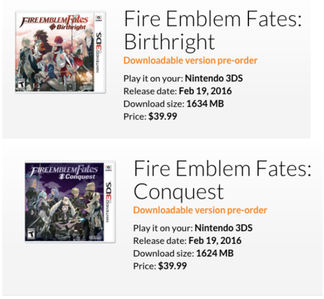 North American Fire Emblem Fates file size, pre-order digitally from Nintendo
