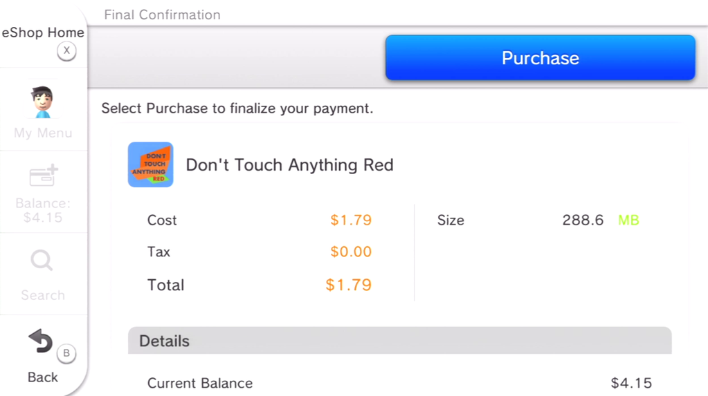 The file sizes for today’s digital Nintendo downloads keep coming in! This one is for Don’t Touch Anything Red. You’ll need 288.6MB of space in order to download the game.