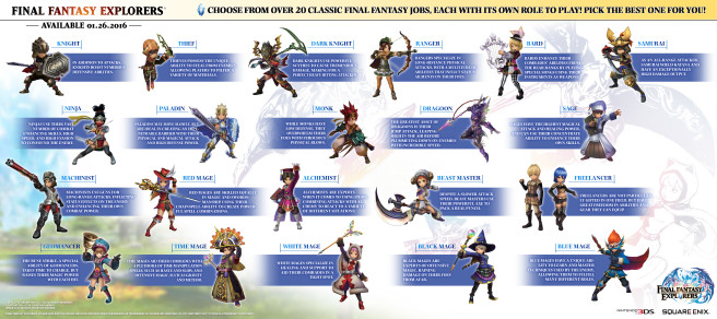 Square Enix has released a new Final Fantasy Explorers infographic that shows off the game’s various jobs. There are 21 in total, each of which have their own unique abilities and skillsets.