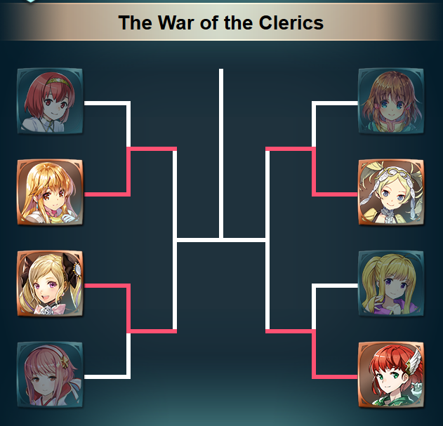 The first round of the War of the Clerics Voting Gauntlet in Fire Emblem Heroes has ended – Lachesis, Elise, Lissa and and Priscilla were victorious and have moved on to the second round. If you supported a winning team in the first round, you get a bonus of 500 feathers and keep fighting for the same team in round 2. If you were on the losing side, you get no bonus, but get to pick a new team in round 2.