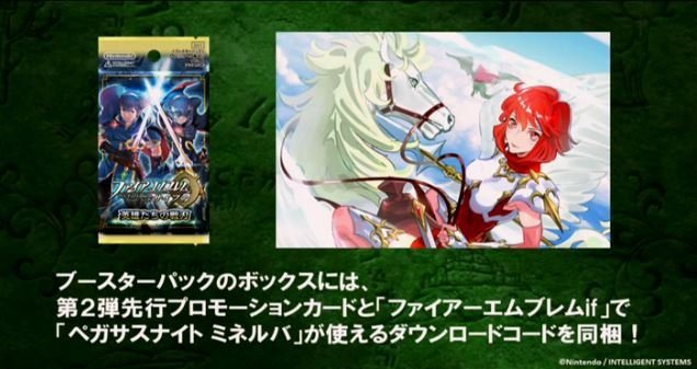 A photo from Japanese website Inside Games provides a look at the “Dark War Volume”. This has a download code for “The Prince of Altea, Marth” while the “Awakening Volume” starter deck contains a code for “The Swordsman Who Goes By Marth, Lucina”. Additionally, the booster box features a preview card of the next series of cards and a code to get “Pegasus Knight Minerva” in Fire Emblem If.