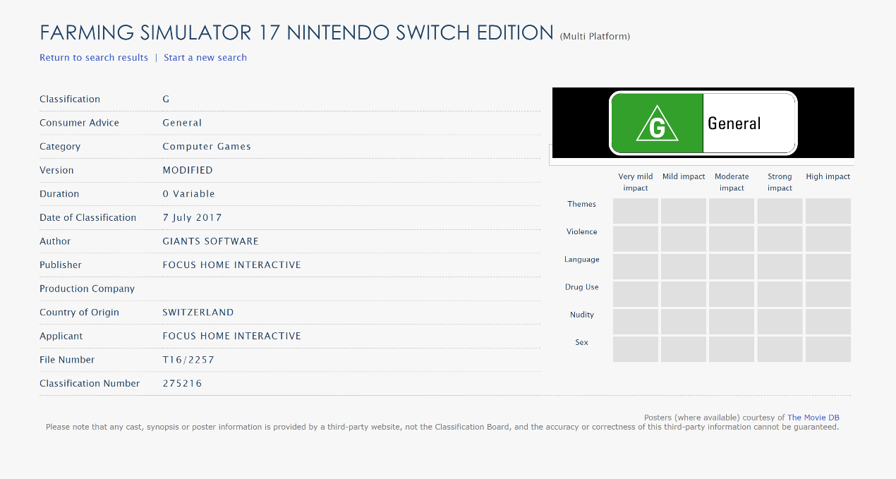 Assuming the classification is accurate, it is a bit odd that Switch would be getting Farming Simulator 17 rather than Farming Simulator 18. On 3DS, Farming Simulator 18 released last month.