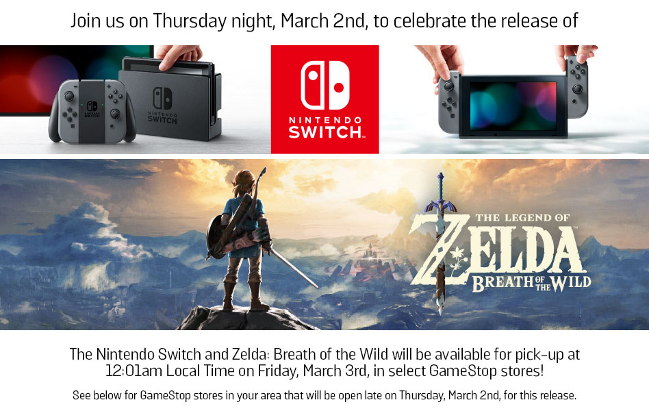 GameStop has now opened an official page on its website for the midnight Switch launch. You can head on over here to find out which stores nearby will be open as soon as March 3 arrives. Of course, this includes Zelda: Breath of the Wild as well.