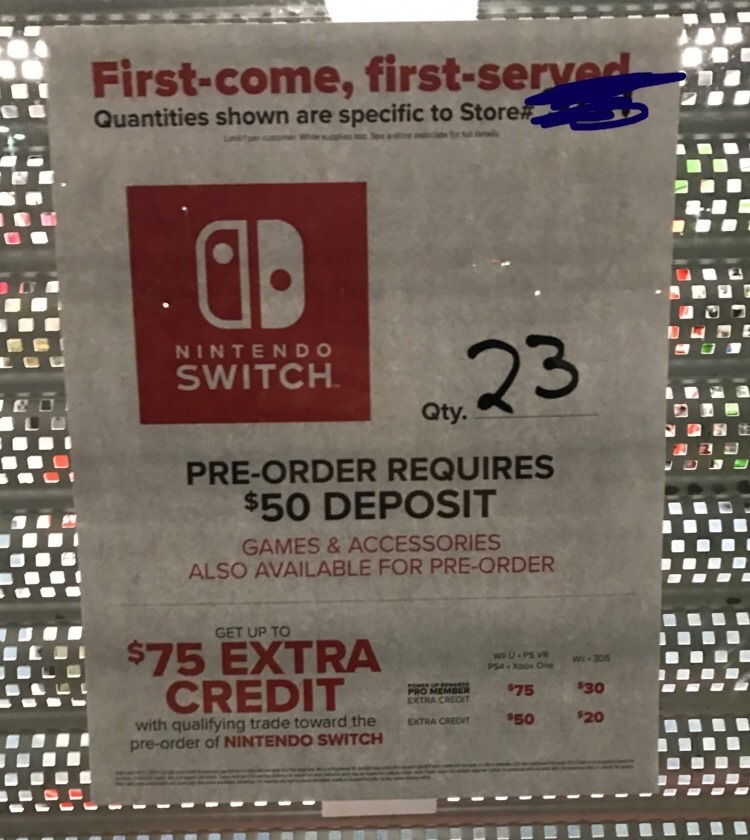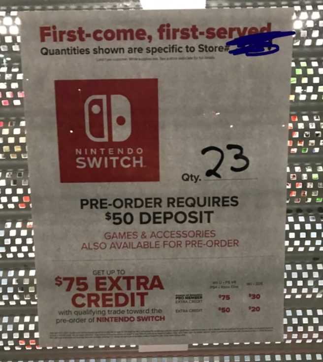 As of tomorrow, GameStop stores will begin accepting pre-orders for Switch. Thankfully, it now looks like various locations are putting up notices indicating how many units they have available. The number should give consumers a better idea about the pre-order situation.