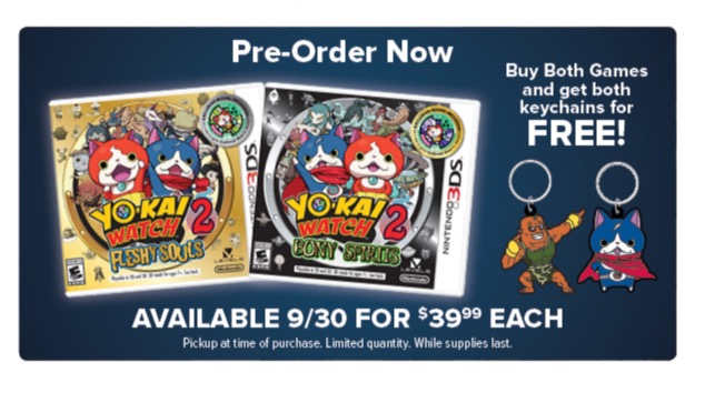 This week’s GameStop ad makes mention of a new pre-order offer for Yo-kai Watch 2. By reserving both versions, you’ll be able to obtain a pair of keychains. Quantities will be limited, and will be distributed while supplies last.