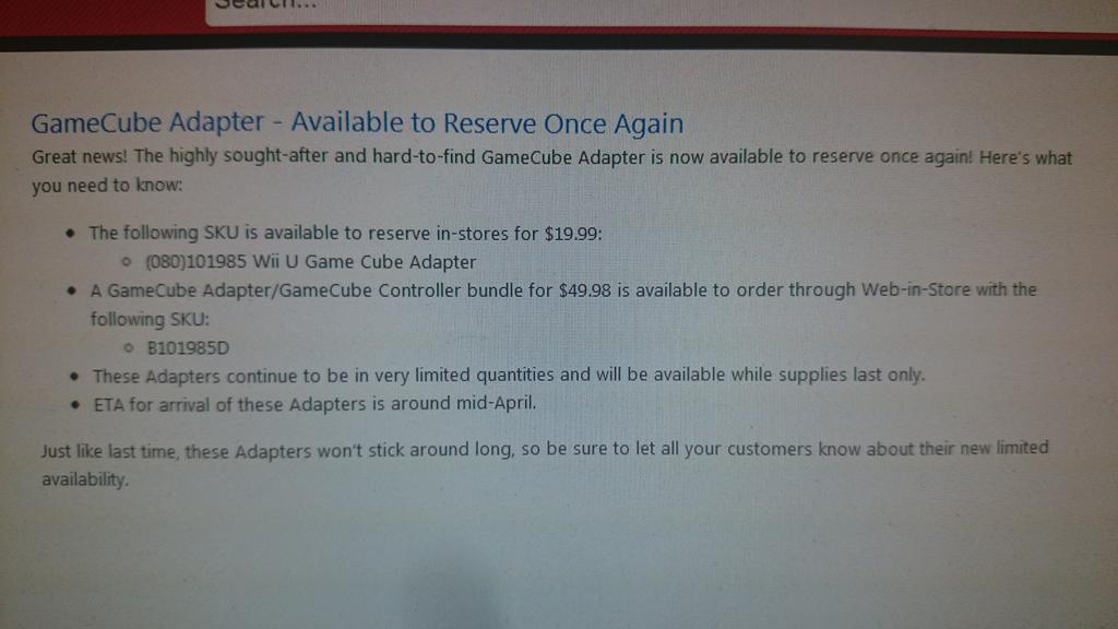 GameStop is now taking in-store GameCube Controller Adapter for Wii U pre-orders. The standard adapter can be reserved normally, though the bundle containing both the adapter and controller need to be ordered through Web-in-Store.