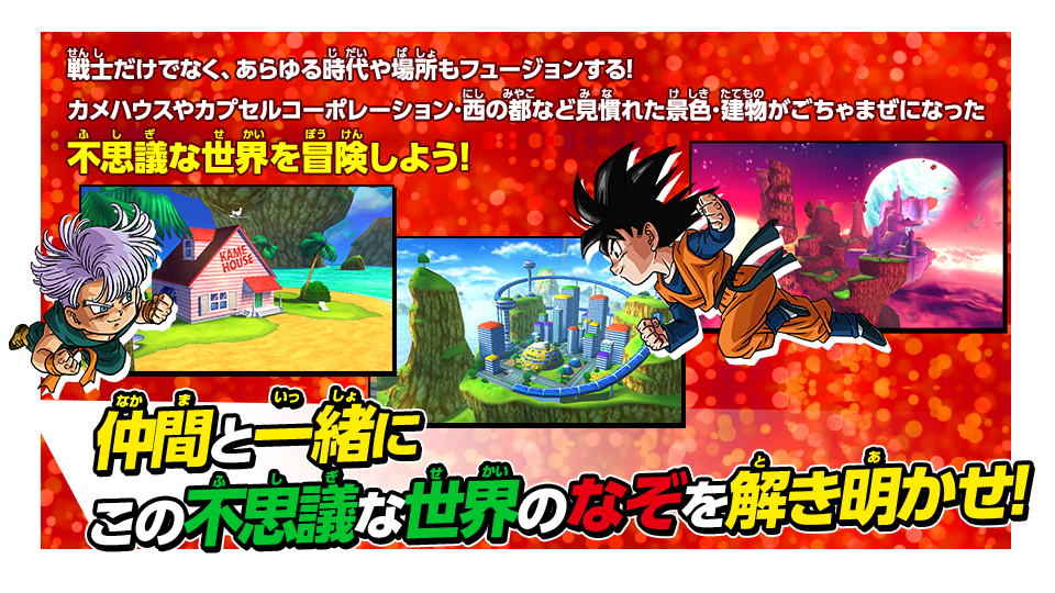 Dragon Ball: Fusions is a collection and raising-type RPG. Players can find characters from the Dragon Ball world, gather them, and go on adventures.