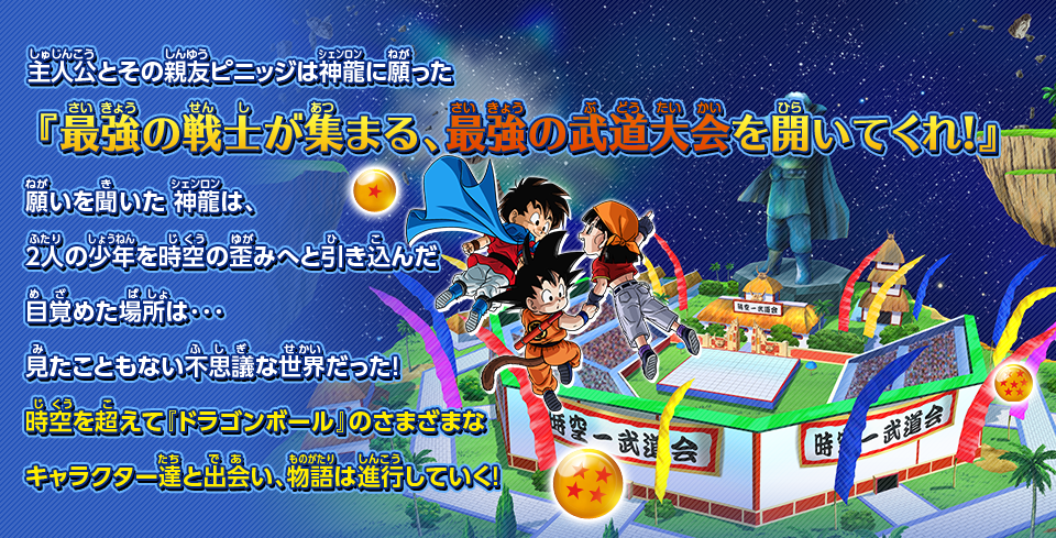 Finally, as far as the story is concerned, the player and Pinich make a wish to Shenron to create the strongest Budokai in the universe. In turn, the world of Dragon Ball is fused together to participate in the Jikuuichi Budokai.