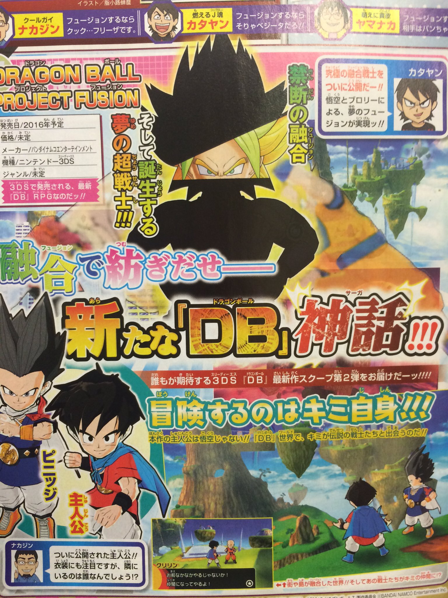 ShonenGames has managed to obtain the full scan of Dragon Ball: Project Fusion from this month’s V Jump. As it turns out, the game has a new, final name. It’ll be called “Dragon Ball: Fusions” from here on out.