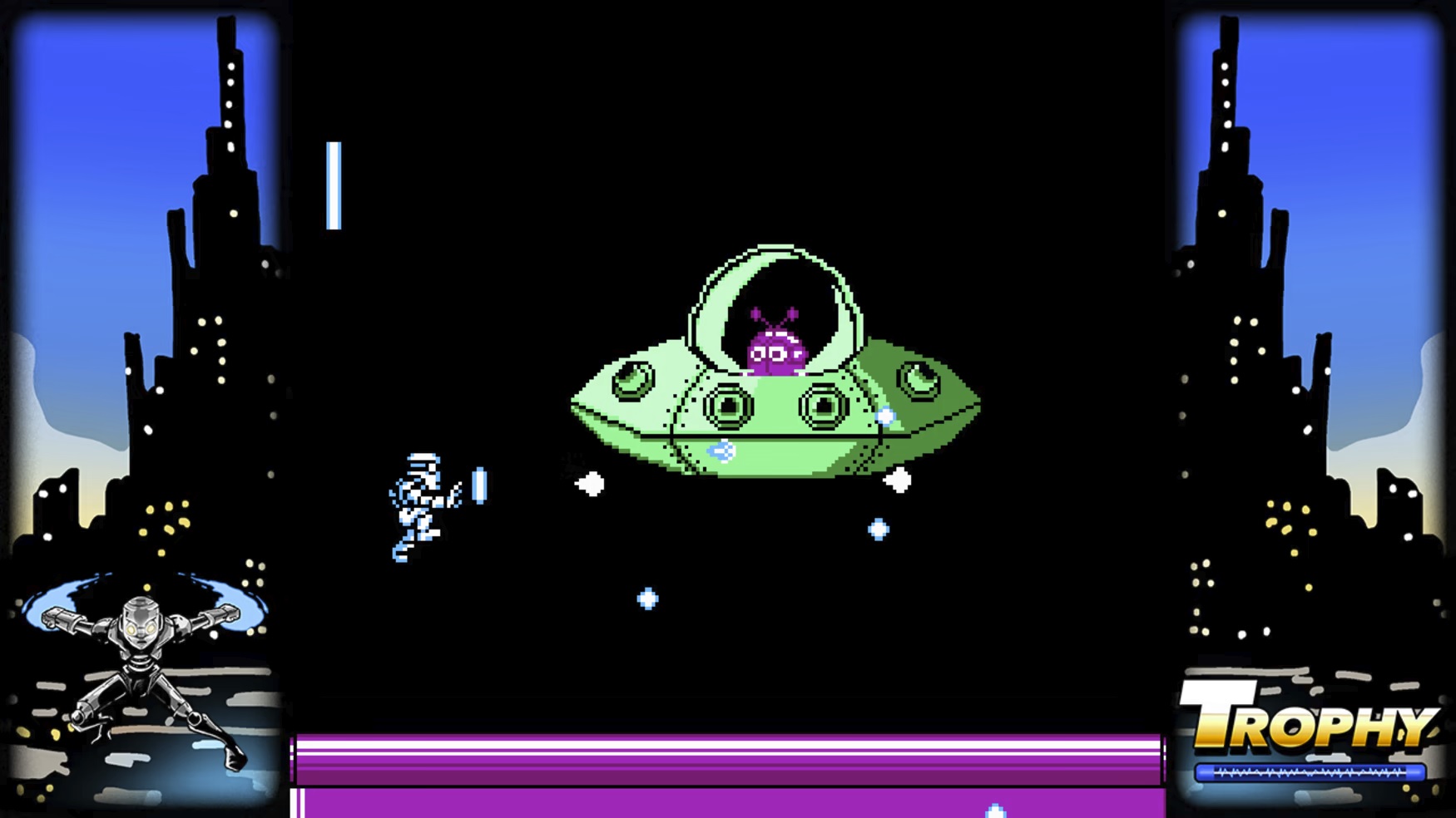 Trophy, an 8-bit action platformer that previously released as a NES cartridge, “features the classic movements of running, jumping, and shooting, and strives for a pure platforming experience, unhampered by excessive power-ups or useless abilities.” Games like Mega Man and Capcom’s Disney classics have been cited as inspirations.