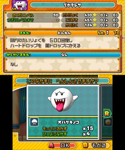 Let’s talk about those random pieces of information first. Famitsu first mentions that a skill can be used after a certain number of turns have passed. This number can be reduced by leveling up the skill in a Toad House. When a skill is activated, a cut-in is shown.