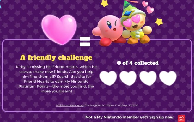 Aside from the usual information and media, the site also holds something interesting for My Nintendo members. Users can earn Platinum Points by finding Kirby’s missing Friend Hearts. There are four in total, each giving 25 Platinum Points. You’ll have until September 30 to complete the challenge.
