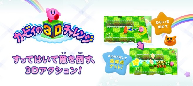 Kirby 3D Rumble is actually called Kirby 3D Challenge in Japanese, but the former name should be used in the English version based on what was mentioned in Nintendo’s fact sheet (since removed). As for the actual game, it’s a 3D action spin-off that takes place on a 3D plane. The goal on each stage is to clear out all the enemies, which is done by picking them up and spitting them out (rather than absorbing their powers). Taking out multiple enemies with a shot increases Kirby’s combo and helps wracks up your total score. There are various kinds of terrains and placements in each stage.