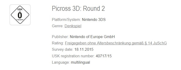 The USK, Germany’s ratings board, has added in a listing for “Picross 3D: Round 2”. Although it submitted towards the end of last year, the listing was only made public recently.