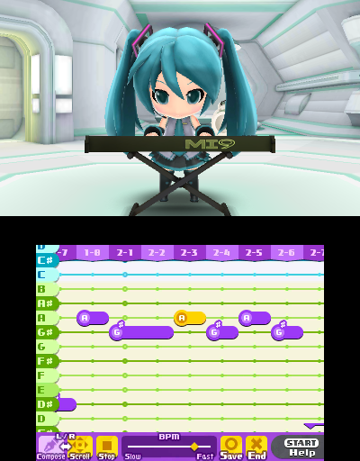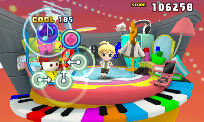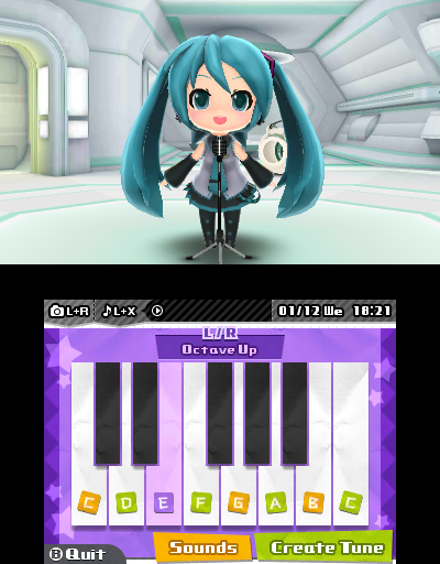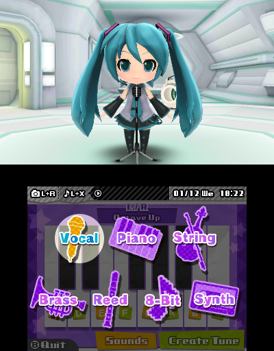 Hatsune Miku is full of content beyond just the rhythm game, and among the ones we think people will spend an inordinate amount of time with are the StreetPass features! Our personal favorite is being able to create your own Miku tune using a variety of instruments, including vocaloids, traditional instruments, synthesizers and chiptunes! Use the sounds and the keyboard to create a four-bar tone that you can share with anyone you StreetPass.