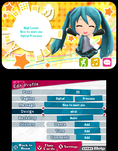 The same goes for your profile card, which you can design by selecting a variety of backgrounds and looks, change character poses, create a tagline, write your own message, and more as options are unlocked by completing the rhythm game! Show off your Mirai DX prowess!