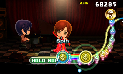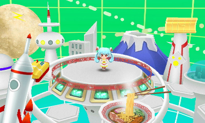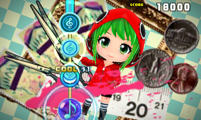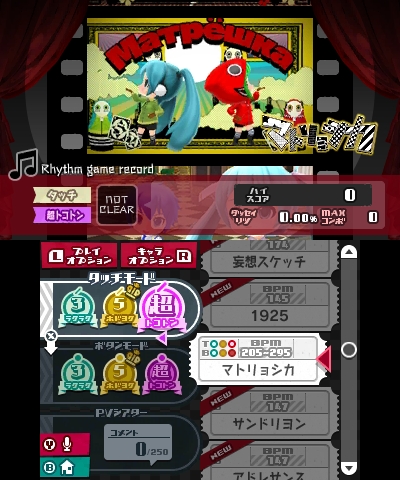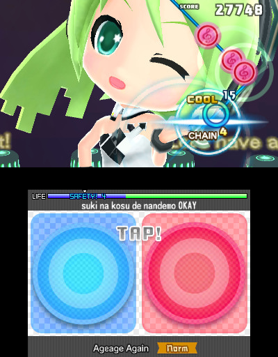 Theatre mode lets players relax from tapping or button-pressing and watch the music video. The videos are browsable, so players can skip to their favorite parts, and make playlists of their favorite songs. It’s even possible to create scrolling messages on the videos (a la Nico Nico Douga), which can be shared via StreetPass, and updated via SpotPass. Theatre Mode also has “Jam Along” mode, which lets players interact and add their own sound flairs to songs!
