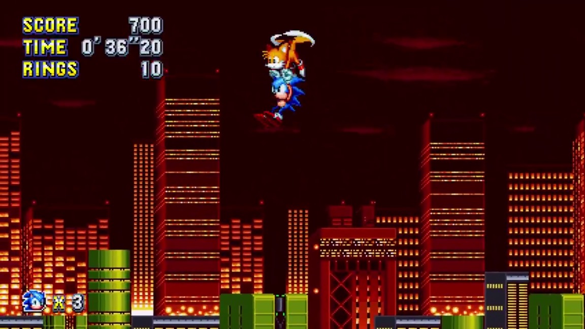 Sonic Mania has a neat little feature that you may not be aware of. When playing alone, if you hold ↑ and press Jump twice, Tails will carry you.