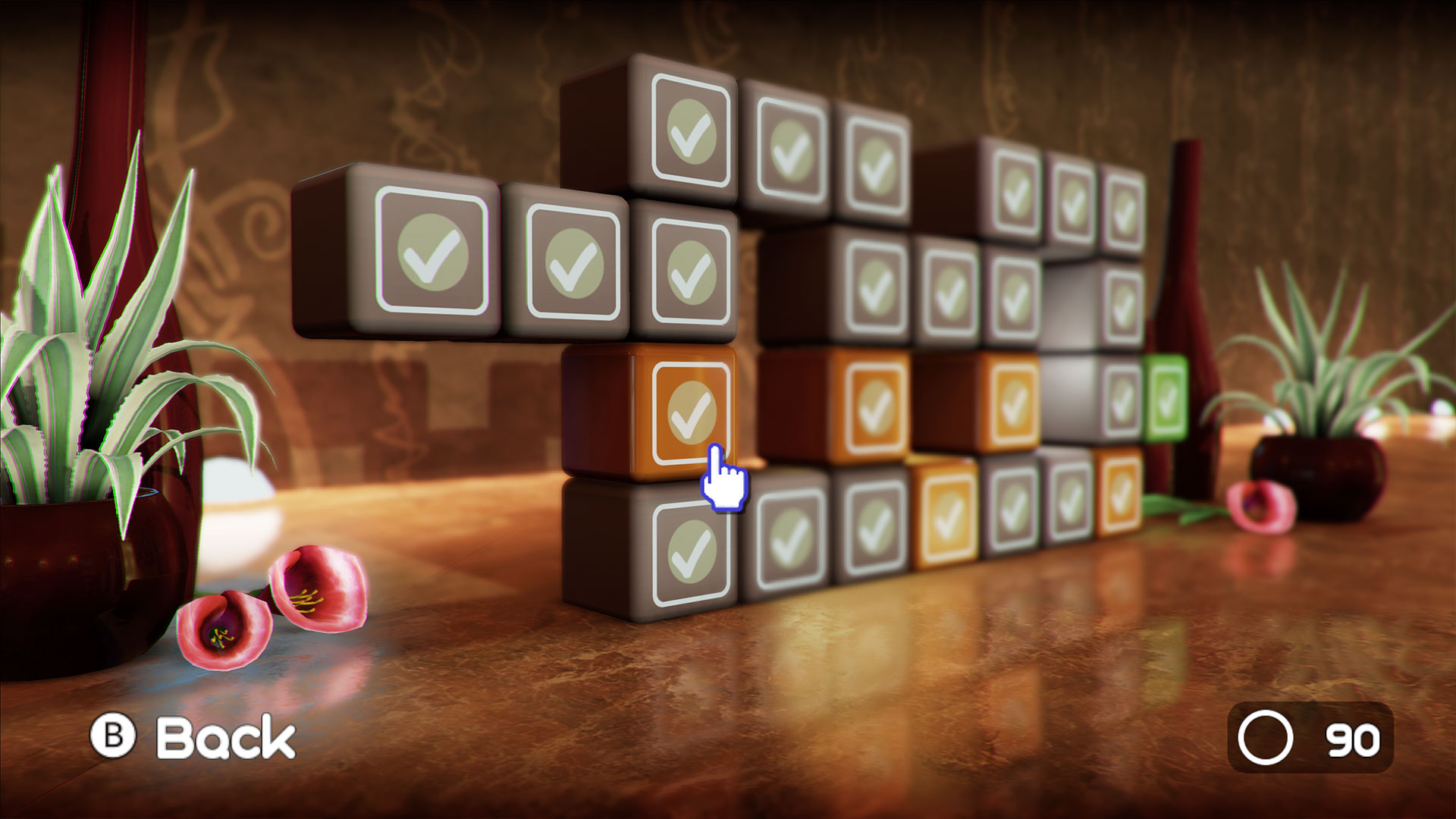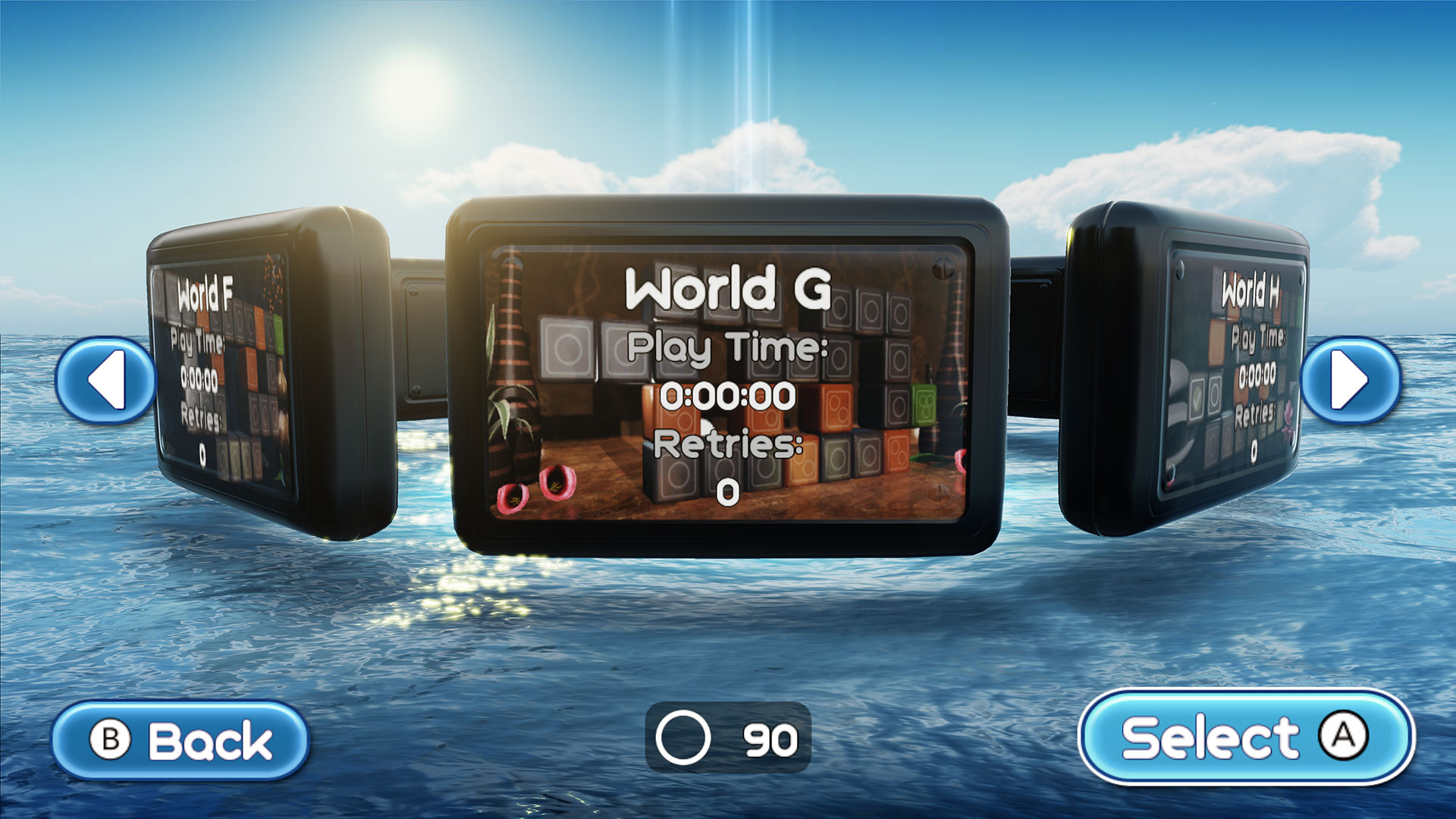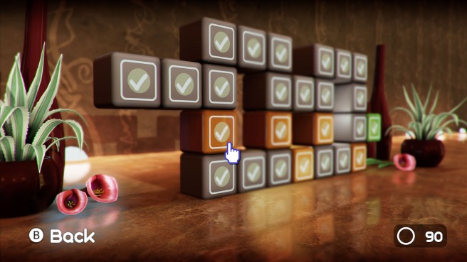 When developing the original game on Wii, we realized that a simple 2D grid would be good enough for a level select menu, but that in itself was too boring. So we came up with the idea of stacked boxes in a lush 3D environment. We think coming back to the this beautiful menu gives players a nice break after solving a level. On Wii U, we had tons of performance to waste on this screen so we implemented quite a number of effects.