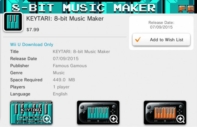 Famous Gamous is bringing “KEYTARI: 8-bit Music Maker” to Wii U next week, according to a listing on the eShop. The title is due out on July 9 for $7.99.