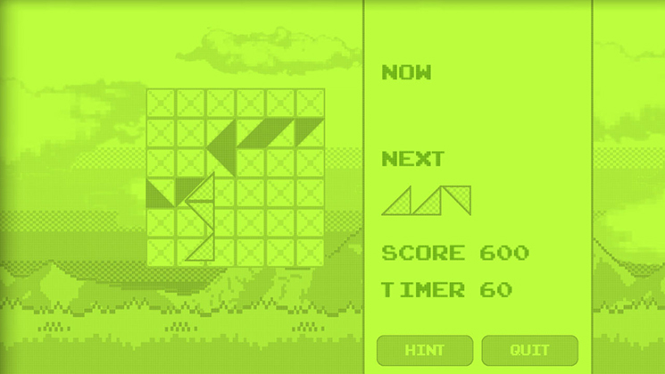 It’s a retro-themed single-player puzzle game, much in the style of 90?s era puzzle games. Score points by arranging rows of triangular tiles into quads. Your score multiplies by however many quads you can create in a single move. Enjoy strategic gameplay at a fast pace in the Arcade mode. Push yourself to the limit in the five Challenge modes. Weep for mercy in the time-based challenges of the Super-Hardcore mode!