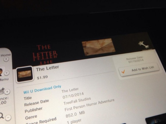 TreeFall Studios’ first-person horror adventure “The Letter” appears to be coming to the North American Wii U eShop next week. The digital store has the game listed for a July 10 launch. Pricing is set at $1.99.