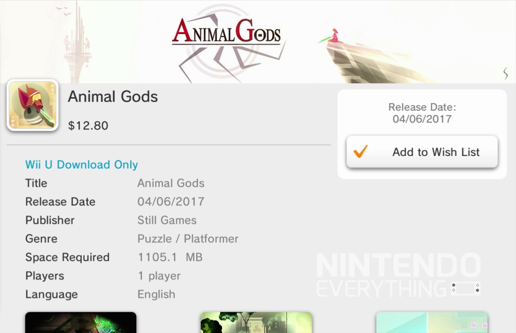 Animal Gods ended up releasing towards the end of 2015. About a year and a half later, it’s finally launching on Wii U. A listing on the eShop shows a date of April 6.