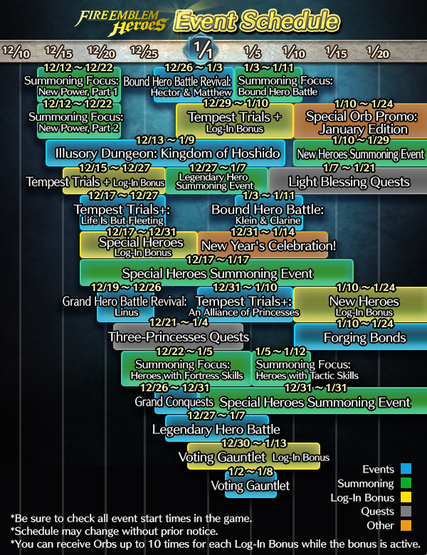 Other than the two New Power Summoning Foci, we’ve got two other bits of Fire Emblem Heroes news for you today. Intelligent Systems revealed the event calendar for the game up through January, which you can see above. All of the regular events are present as usual, and there will also be two Special Heroes summoning events, which will likely be Christmas and New Years-themed, given their timing.