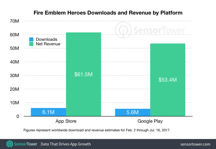 Fire Emblem Heroes has been downloaded over ten million times worldwide across iOS and Android. The more interesting stat reveals that Nintendo has generated over $100 million from the game. $61.5 million is from iOS while another $53.4 million is from Android users.