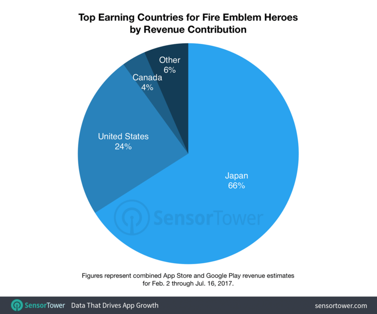 Fire Emblem Heroes has been downloaded primarily by Japanese users, who make up 66 percent of the game’s userbase. The United States is next at 24 percent, followed by Canada at 6 percent.