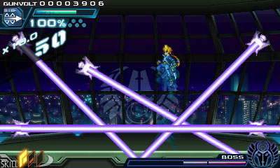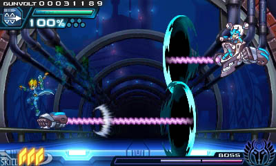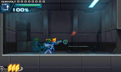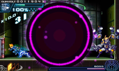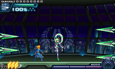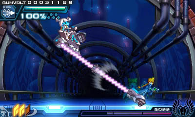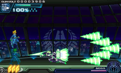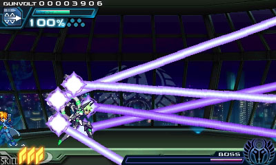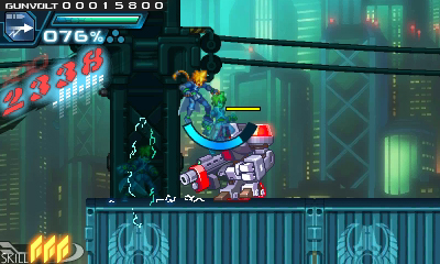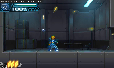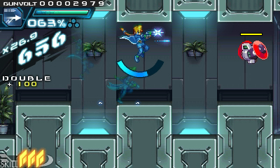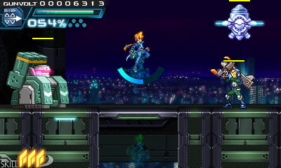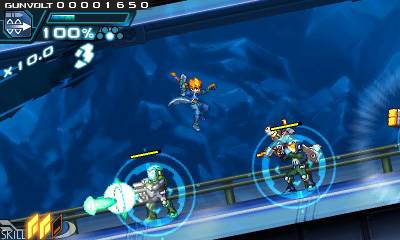 – A small drone hovers behind Gunvolt, firing darts in seven directions