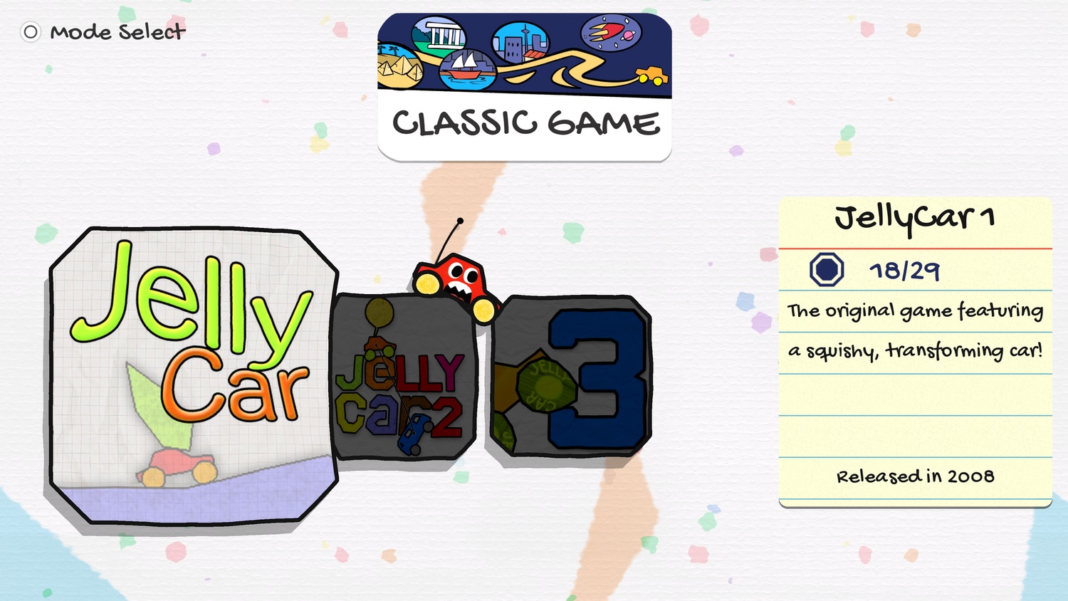 Switch players can now access the classic level selector. It includes every level from the 2008 App Store success story, JellyCar.