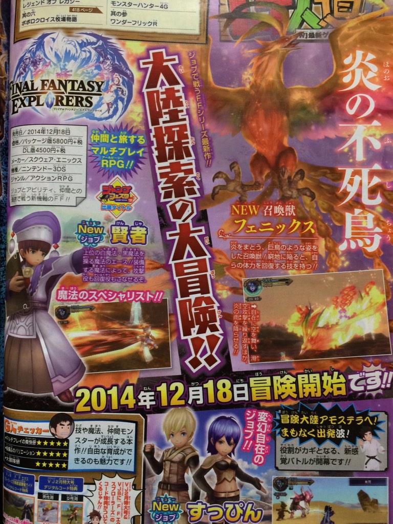 This week’s issue of Jump has yet another update on Final Fantasy Explorers. The magazine confirms that the reoccurring summon Phoenix will be appearing as a foe. Jump also confirms Freelancer and Sage as two more jobs, the latter of which allows for powerful white and black magic.