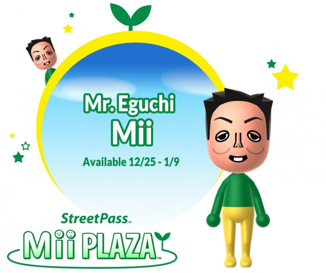 3DS owners who bring their system to a Nintendo Zone location can receive Katsuya Eguchi’s Mii. He’ll be available until January 9. After receiving Eguchi’s Mii, you should be able to find him wearing gold pants in the StreetPass Mii Plaza.