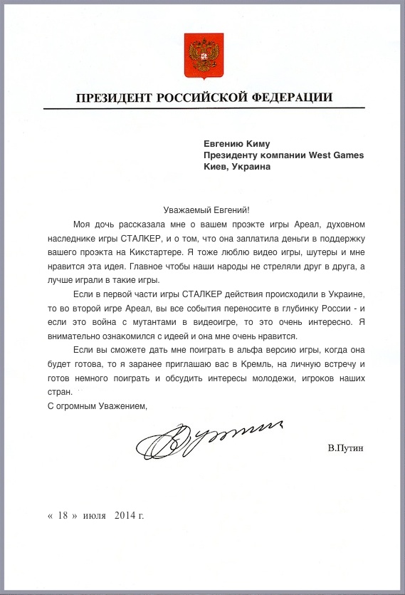 The oddities don’t end there, strangely enough. On Saturday, West Games shared a typed and signed letter it had received from someone claiming to be Russian president Vladimir Putin.