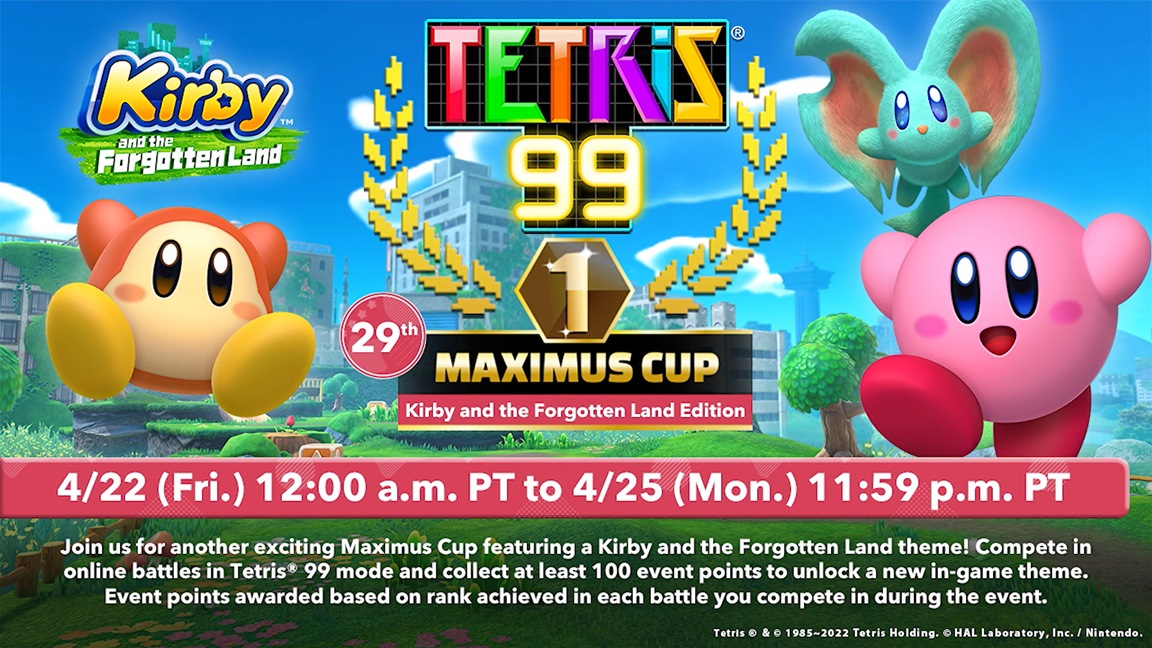 Nintendo has announced that Tetris 99 will soon be kicking off its 29th Maximus Cup, and players will have an opportunity to obtain a new theme based on Kirby and the Forgotten Land.