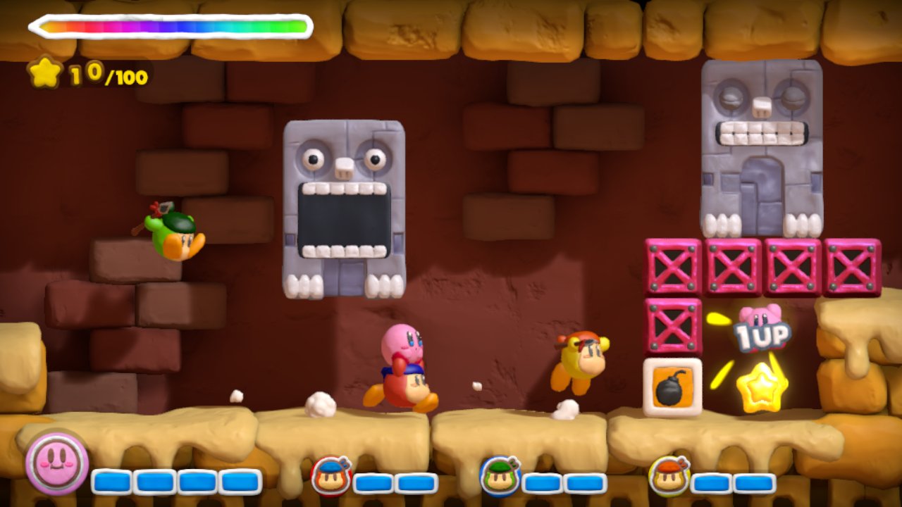 When we saw the Wii U GamePad for the first time, we thought it could be interesting to use the different roles of the GamePad and TV in multiplayer. From there on, we came up with an idea of using the Wii Remote to control Waddle Dee and the GamePad to draw footholds. And the system of Kirby Canvas Curse fit that, so we used it. The result, after applying everyone’s voice, was a very lively game.