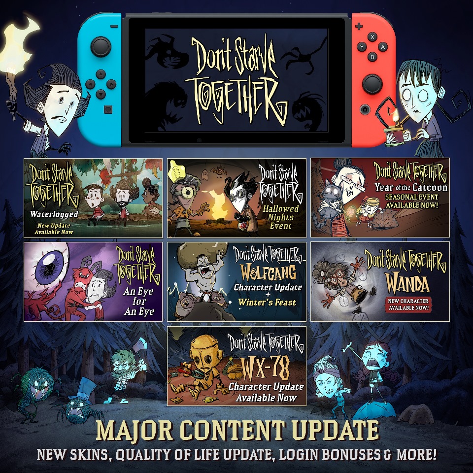 All content patches on PC up to the WX-78 rework are included. Switch players now have access to Waterlogged, Hallowed Nights, Year of the Catcoon, The Eye for an Eye crossover with Terraria, The Wolfgang and WX-78 character refreshes, Wanda, the crafting menu rework, some seasonal events, and a ton of new skins. More minor performance tweaks have been implemented as well.