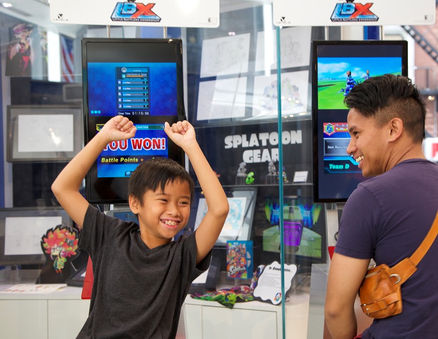 In this photo provided by Nintendo of America, Marques Y. (left), 10 years old from Toronto, Canada, reacts to winning a 3-on-3 battle in Little Battlers eXperience, the new Nintendo 3DS game based on the popular Nicktoons TV show, as his father Randolph G. watches. Nintendo partnered with Nickelodeon for an exclusive screening of two new episodes of Nicktoons’ LBX: Little Battlers eXperience TV show at the Nintendo World store in New York on Saturday, Aug. 22, 2015. Attendees were able to play the new Nintendo 3DS game based on the show with experts from Nintendo. The new game lets players customize their own mini robots using more than 4,000 parts and battle other players’ robots.Photo 2